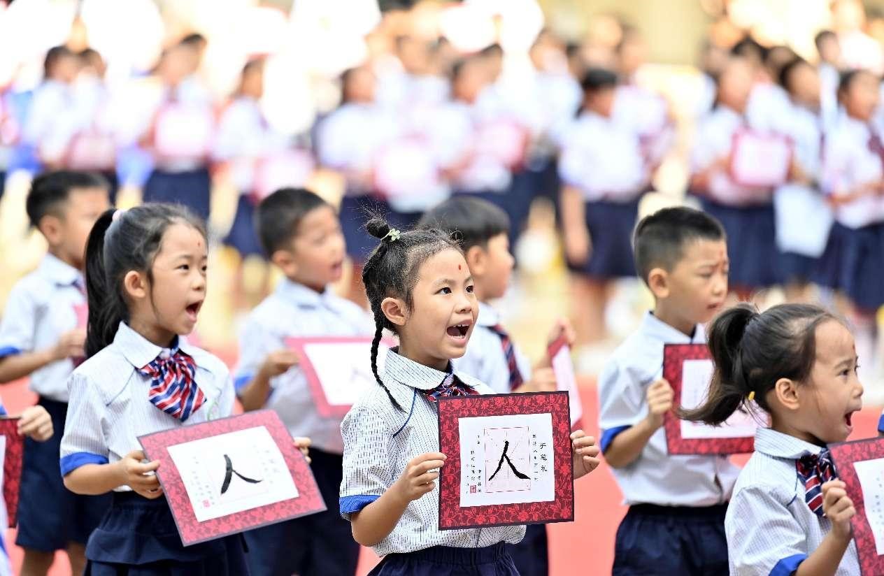 First graders at an elementary school in Liuzhou, south China's Guangxi Zhuang autonomous region, recite Chinese classics under the guidance of their teachers. (People's Daily Online/Li Hanchi)