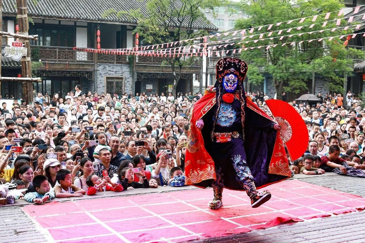 A face-changing performance of Sichuan Opera, an intangible cultural heritage item, is staged in an ancient town in Luzhou, southwest China's Sichuan province. (People's Daily Online/Li Guiping)