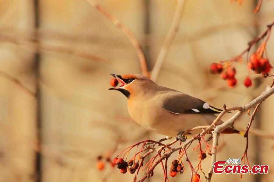 A waxwing picks fruit from a tree in Ergune, Hulunbuir city, north China's Inner Mongolia autonomous region. (Photo: China News Service/Wu Zhiying)