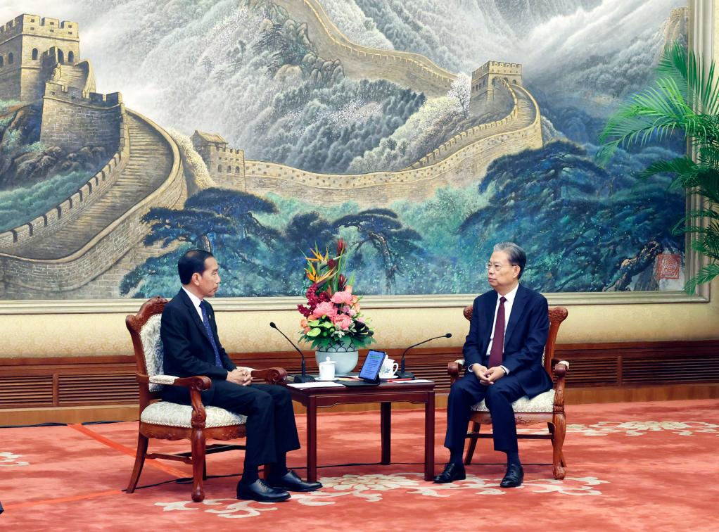 Zhao Leji, chairman of the National People's Congress (NPC) Standing Committee, meets with Indonesian President Joko Widodo in Beijing, capital of China, Oct. 18, 2023. (Xinhua/Liu Weibing)