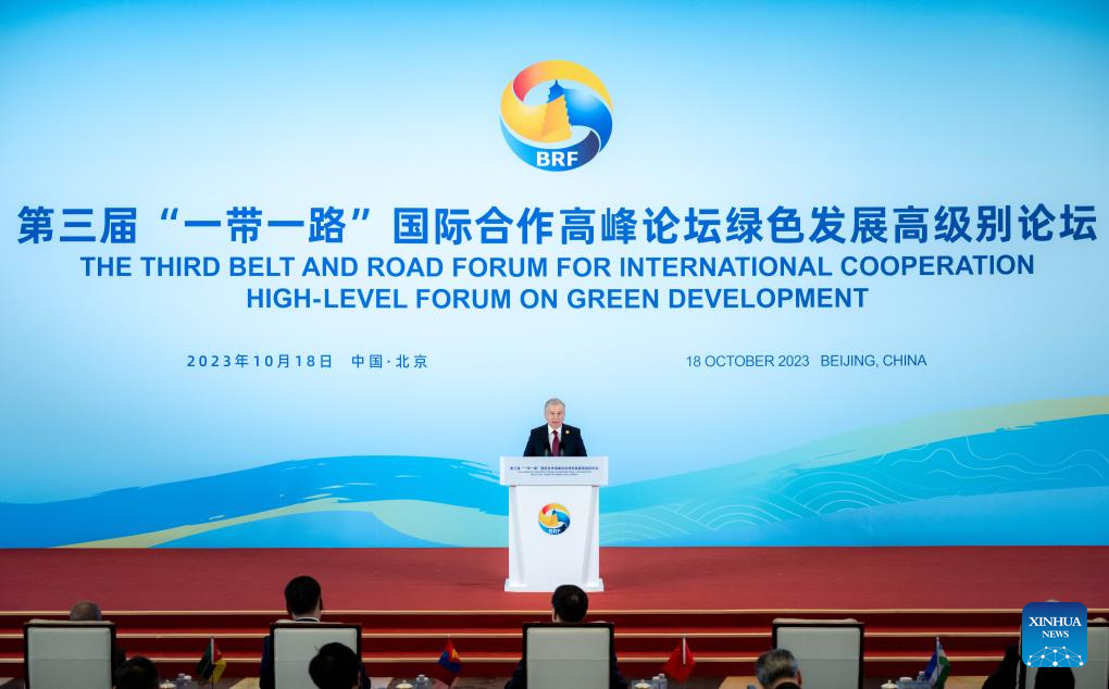 Uzbek President Shavkat Mirziyoyev addresses the High-Level Forum on Green Development of the third Belt and Road Forum for International Cooperation in Beijing, capital of China, Oct. 18, 2023. (Xinhua/Zhai Jianlan)