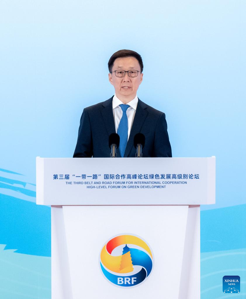 Chinese Vice President Han Zheng addresses the High-Level Forum on Green Development of the third Belt and Road Forum for International Cooperation in Beijing, capital of China, Oct. 18, 2023. (Xinhua/Zhai Jianlan)