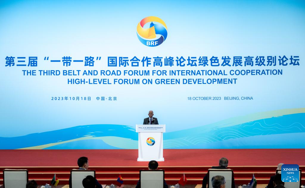 Prime Minister of Mozambique Adriano Maleiane addresses the High-Level Forum on Green Development of the third Belt and Road Forum for International Cooperation in Beijing, capital of China, Oct. 18, 2023. (Xinhua/Zhai Jianlan)