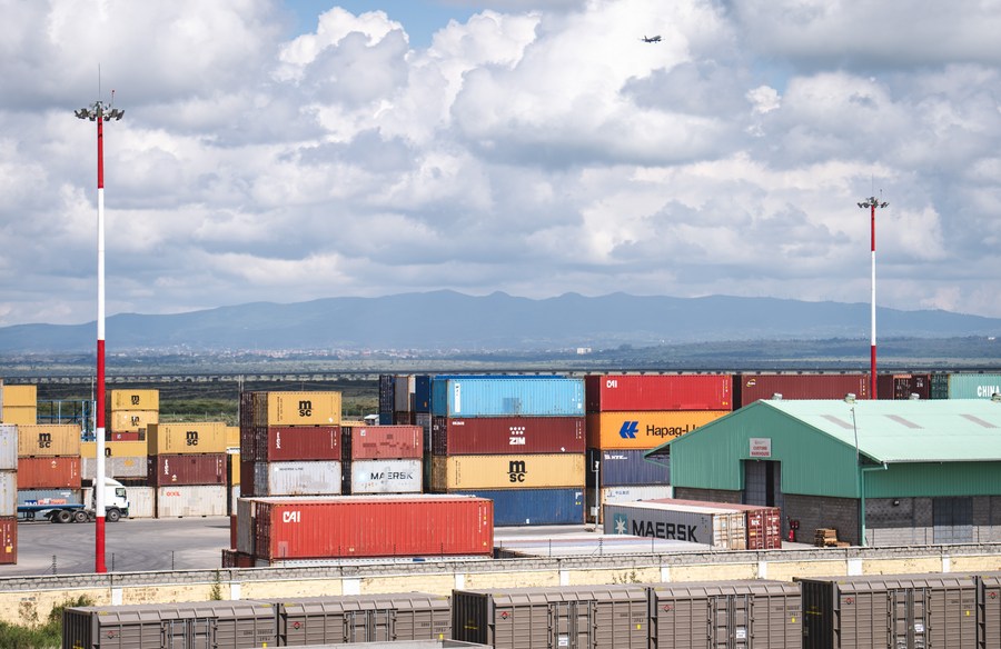 This photo taken on May 23, 2023 shows containers to be transported near the Nairobi Station of the Mombasa-Nairobi Railway in Nairobi, Kenya. [Photo/Xinhua]