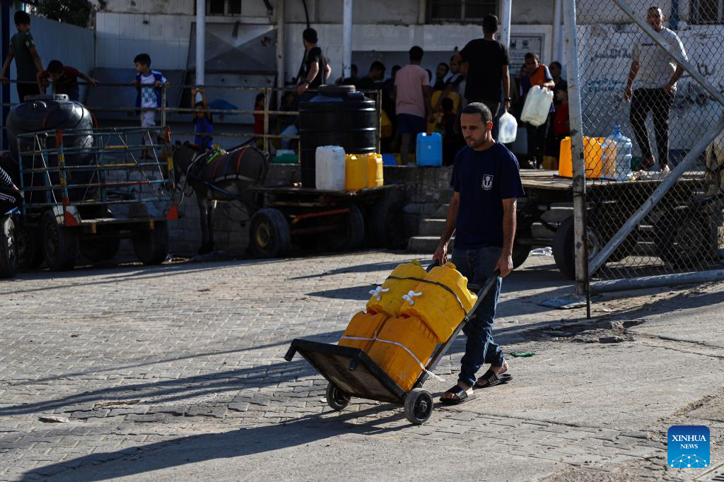 A Palestinian man transports water in the southern Gaza Strip city of Khan Younis, on Oct. 18, 2023. The Palestinian Islamic Resistance Movement (Hamas) on Oct. 7 showered Israel with thousands of rockets in a rare surprise attack, to which Israel responded with massive airstrikes on Gaza and punitive measures, including a siege on the enclave with supplies of water, electricity, fuel, and other necessities being cut off. The ongoing Israel-Hamas conflict, as it entered the 12th day, has killed more than 4,000 people on both sides. (Photo by Rizek Abdeljawad/Xinhua)