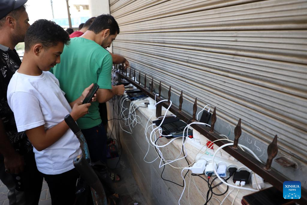 Palestinians charge phones from one power source in the southern Gaza Strip city of Khan Younis, on Oct. 18, 2023. The Palestinian Islamic Resistance Movement (Hamas) on Oct. 7 showered Israel with thousands of rockets in a rare surprise attack, to which Israel responded with massive airstrikes on Gaza and punitive measures, including a siege on the enclave with supplies of water, electricity, fuel, and other necessities being cut off. The ongoing Israel-Hamas conflict, as it entered the 12th day, has killed more than 4,000 people on both sides. (Photo by Rizek Abdeljawad/Xinhua)