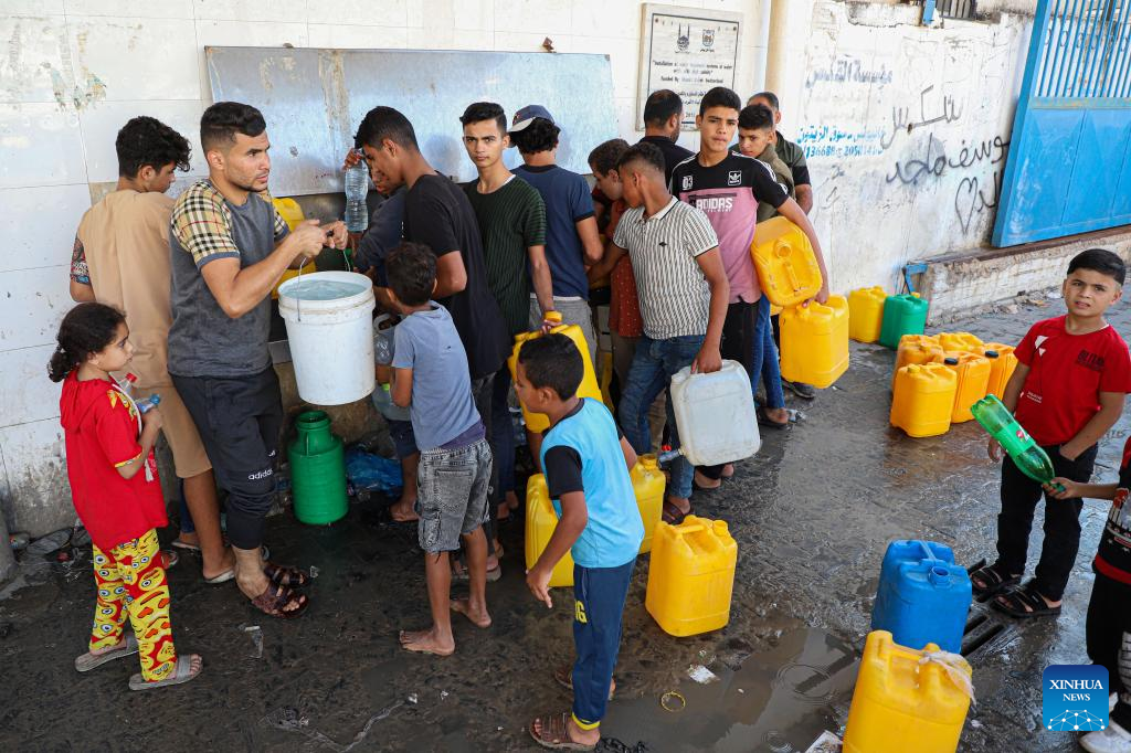 Palestinians fetch water in the southern Gaza Strip city of Khan Younis, on Oct. 18, 2023. The Palestinian Islamic Resistance Movement (Hamas) on Oct. 7 showered Israel with thousands of rockets in a rare surprise attack, to which Israel responded with massive airstrikes on Gaza and punitive measures, including a siege on the enclave with supplies of water, electricity, fuel, and other necessities being cut off. The ongoing Israel-Hamas conflict, as it entered the 12th day, has killed more than 4,000 people on both sides. (Photo by Rizek Abdeljawad/Xinhua)