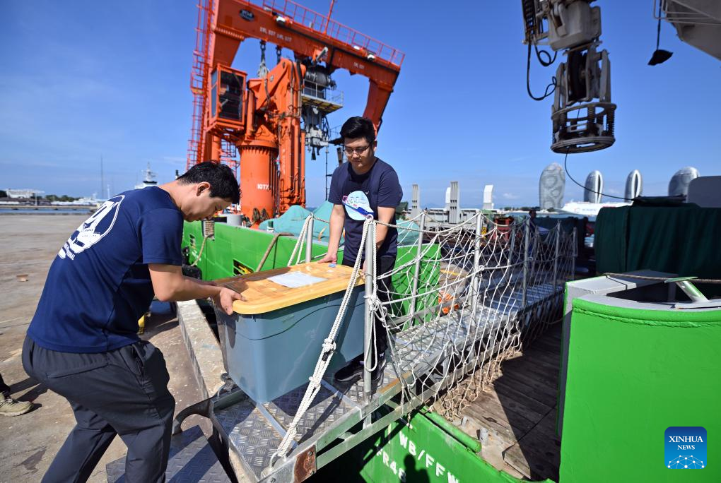 This aerial photo taken on Oct. 10, 2023 shows the scientific research ship Tansuo-2 carrying submersible Shenhai Yongshi (Deep Sea Warrior) returning to Sanya of south China's Hainan Province after conducting deep-sea archaeological investigation in the South China Sea. (Xinhua/Guo Cheng)
