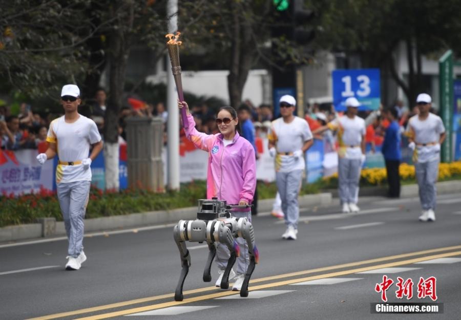 Torch bearer Cai Qionghui (L), accompanied by a robotic guide dog, takes part in the torch relay of the 4th Asian Para Games in Chun'an County, Hangzhou, east China's Zhejiang Province, Oct. 19, 2023. (Photo: China News Service/Wang Gang)