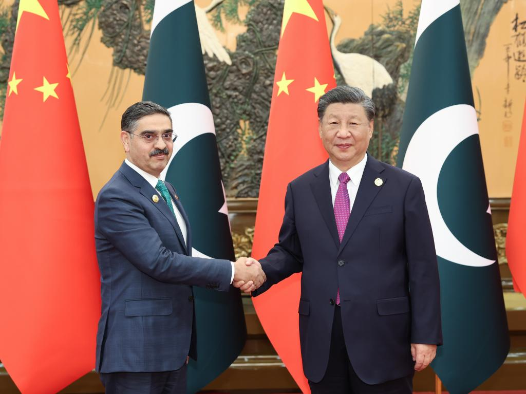 Chinese President Xi Jinping meets with Prime Minister of Pakistan Anwar-ul-Haq Kakar, who is in Beijing for the third Belt and Road Forum for International Cooperation, at the Great Hall of the People in Beijing, capital of China, Oct. 19, 2023. (Xinhua/Huang Jingwen)