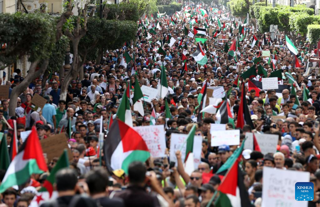 ALGIERS, Oct. 19 (Xinhua) -- Tens of thousands of Algerians took to the streets on Thursday to show their solidarity with the Palestinians and condemn the Israeli airstrikes on the Gaza Strip.