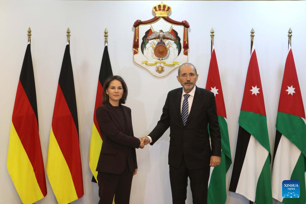 Jordanian Foreign Minister Ayman Safadi (R) meets with German Foreign Minister Annalena Baerbock in Amman, Jordan, on Oct. 19, 2023. Safadi said on Thursday that the kingdom's priority is to immediately stop the Israel-Hamas conflict in Gaza while delivering humanitarian aid. (Photo by Mohammad Abu Ghosh/Xinhua)