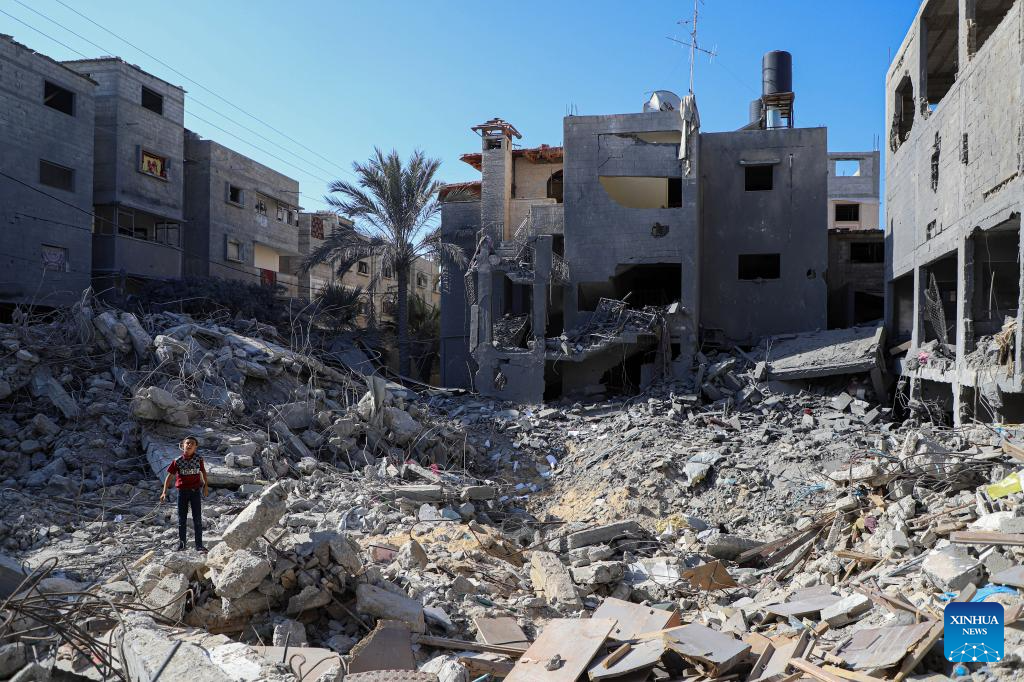 A boy stands on ruins of dwellings destroyed in Israeli airstrikes in the southern Gaza Strip city of Khan Younis, Oct. 20, 2023. The number of Palestinian fatalities has exceeded 3,785, with over 13,000 individuals sustaining injuries since Oct. 7, said the health ministry in Gaza on Thursday. (Photo by Rizek Abdeljawad/Xinhua)