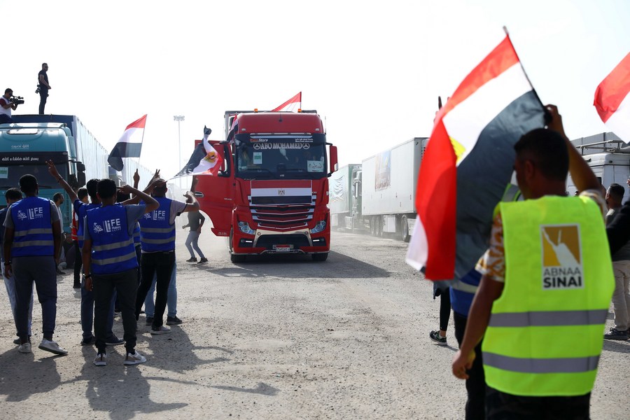 RAFAH, Egypt, Oct. 22 (Xinhua) -- A convoy of 17 trucks carrying humanitarian aid reached the Egyptian side of the Rafah border crossing on Sunday, before heading to the besieged Gaza Strip which is experiencing a humanitarian crisis due to Israeli airstrikes, Egyptian humanitarians at the border said.
