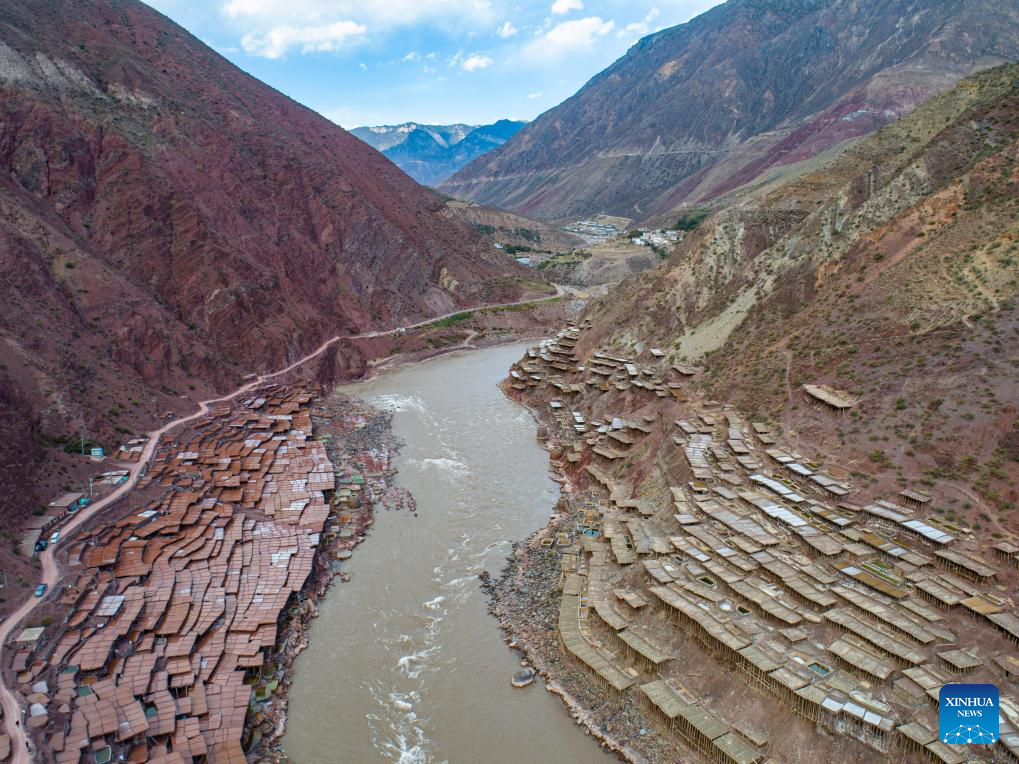This photo taken on Oct. 20, 2023 shows salt fields in Naxi Ethnic Township of Markam County in the city of Qamdo, southwest China's Tibet Autonomous Region. Markam County is known as a place with rich salt resources since ancient China. Salt fields are mainly built on cliff slopes and riversides of the Lancang River. Local people in Naxi evaporate brine in the sun with an ancestral technique since Tang Dynasty (618-907 AD). With a large amount of yearly output of salt products, salt-production has become a main income for local people. Furthermore, the salt fields here and local folk customs also become a unique attraction to visitors. (Xinhua/Sun Fei)