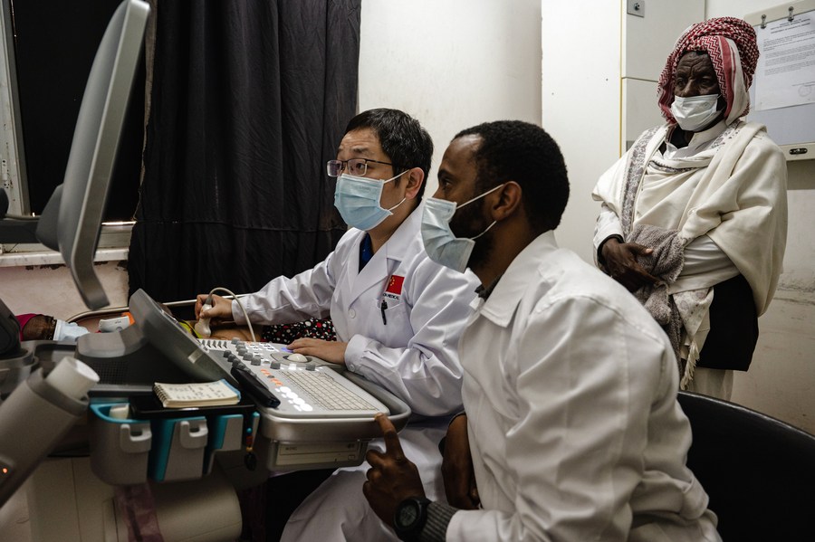 Doctor Wang Xiao (L) conducts an ultrasonic examination for a patient at Orotta Hospital in Asmara, Eritrea, on May 9, 2023. (Xinhua/Wang Guansen)