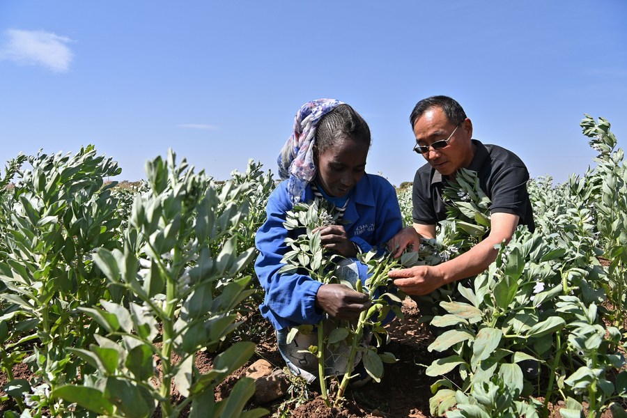 Legume crop expert Liu Yunmin (R) instructs a local farmer on field management of broad beans at a demonstration orchard of agricultural technical assistance, in Asmara, Eritrea, Sept. 27, 2023. (Xinhua/Han Xu)