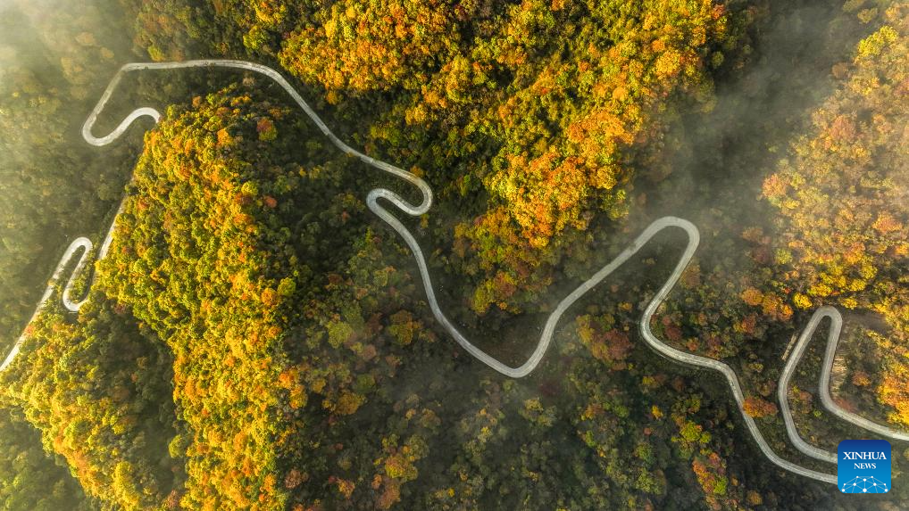 This aerial photo taken on Oct. 22, 2023 shows a scenic road in Liuba County of Hanzhong, northwest China's Shaanxi Province. (Photo by Zhang Lan/Xinhua)