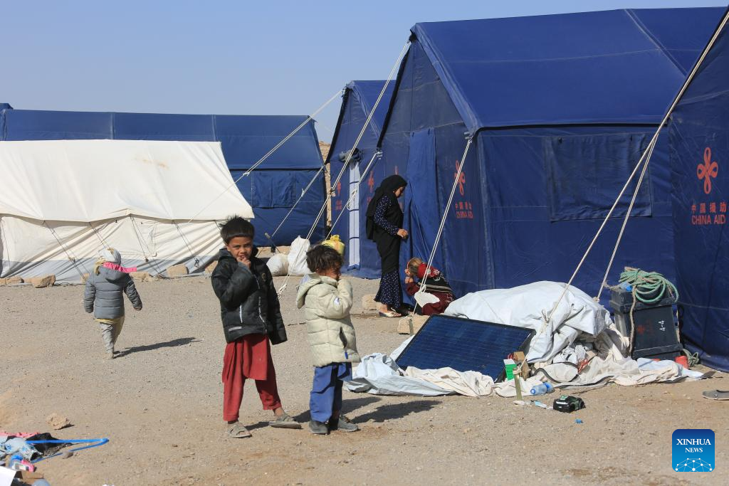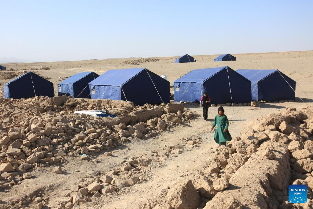 This photo taken on Oct. 16, 2023 shows China-donated tents in Herat Province, Afghanistan. West Afghanistan's Herat province has experienced its ever-destructive earthquakes in recent decades as several tremors, some measuring a magnitude 6.3, caused thousands of casualties. The Chinese government has pledged emergency humanitarian assistance to Afghanistan to help the country with earthquake relief work.(Photo by Saifurahman Safi/Xinhua)