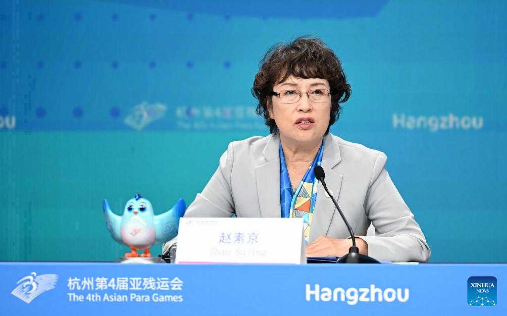 Zhao Sujing, secretary general of the National Paralympic Committee of China and deputy chef de mission of the Chinese Sports Delegation of Hangzhou Asian Para Games, speaks during the joint press conference by the Asian Paralympic Committee (APC) and the Hangzhou Asian Para Games Organizing Committee (HAPGOC) in Hangzhou, east China's Zhejiang Province, Oct. 22, 2023. (Xinhua/Bei He)