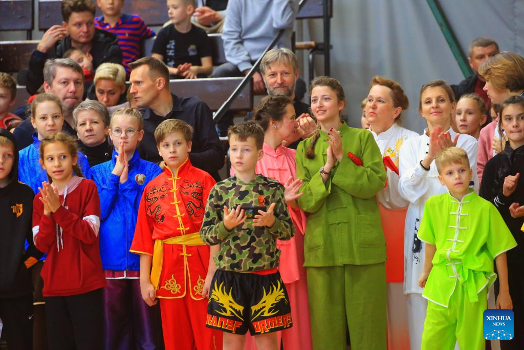 Participants wait for their scores during a Chinese martial arts championship in Minsk, Belarus, on Oct. 21, 2023. (Photo by Henadz Zhinkov/Xinhua)