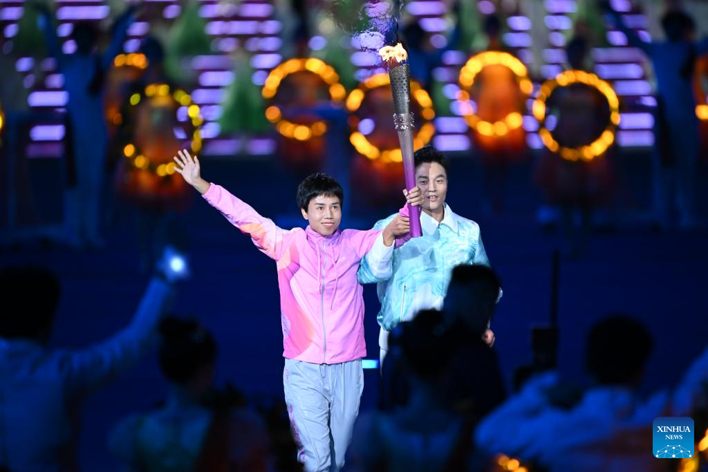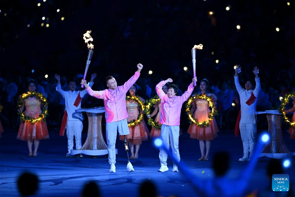Torch bearer Zheng Xiongying (R) and Hou Bin pass the torch during the opening ceremony of the 4th Asian Para Games in Hangzhou of east China's Zhejiang Province, on Oct. 22, 2023. (Xinhua/Jia Haocheng)