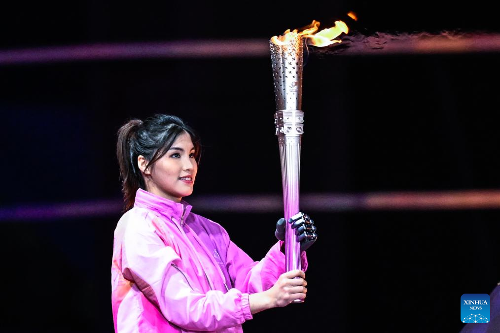 Torch bearer Xu Jialing relays the torch during the opening ceremony of the 4th Asian Para Games in Hangzhou of east China's Zhejiang Province, on Oct. 22, 2023. (Xinhua/Bei He)
