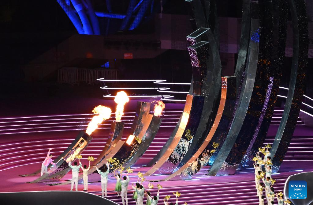 The cauldron is lit during the opening ceremony of the 4th Asian Para Games in Hangzhou of east China's Zhejiang Province, on Oct. 22, 2023. (Xinhua/Han Chuanhao)