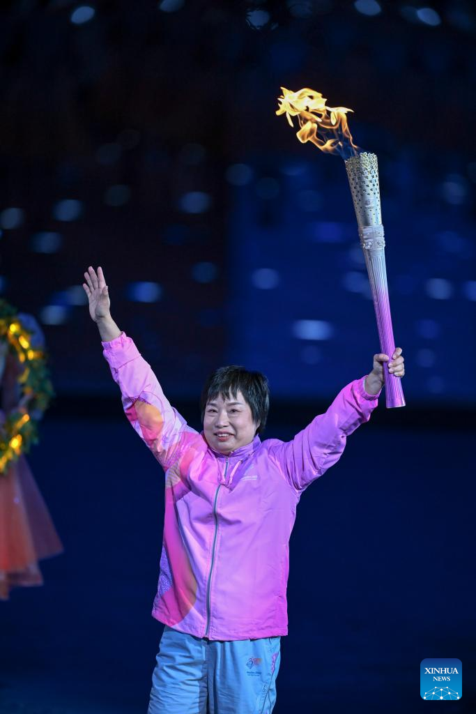 Torch bearer Zheng Xiongying relays the torch during the opening ceremony of the 4th Asian Para Games in Hangzhou of east China's Zhejiang Province, on Oct. 22, 2023. (Xinhua/Cai Yang)