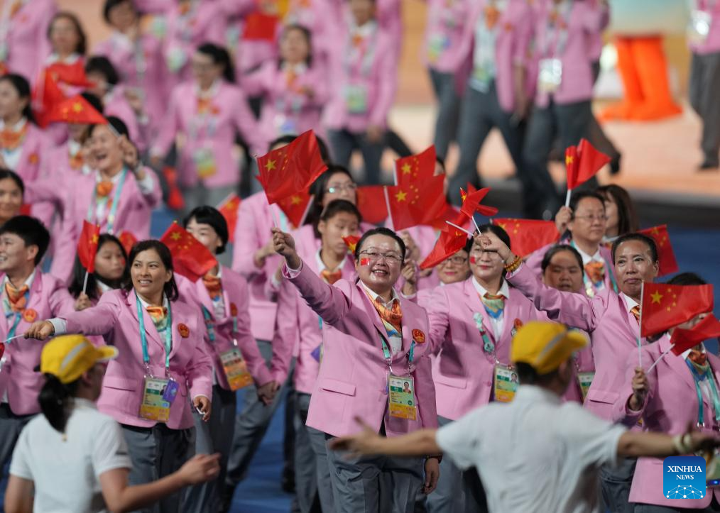 Delegation of China parade into the Hangzhou Olympic Sports Center Stadium during the opening ceremony of the 4th Asian Para Games in Hangzhou of east China's Zhejiang Province, on Oct. 22, 2023. (Xinhua/Cai Yang)
