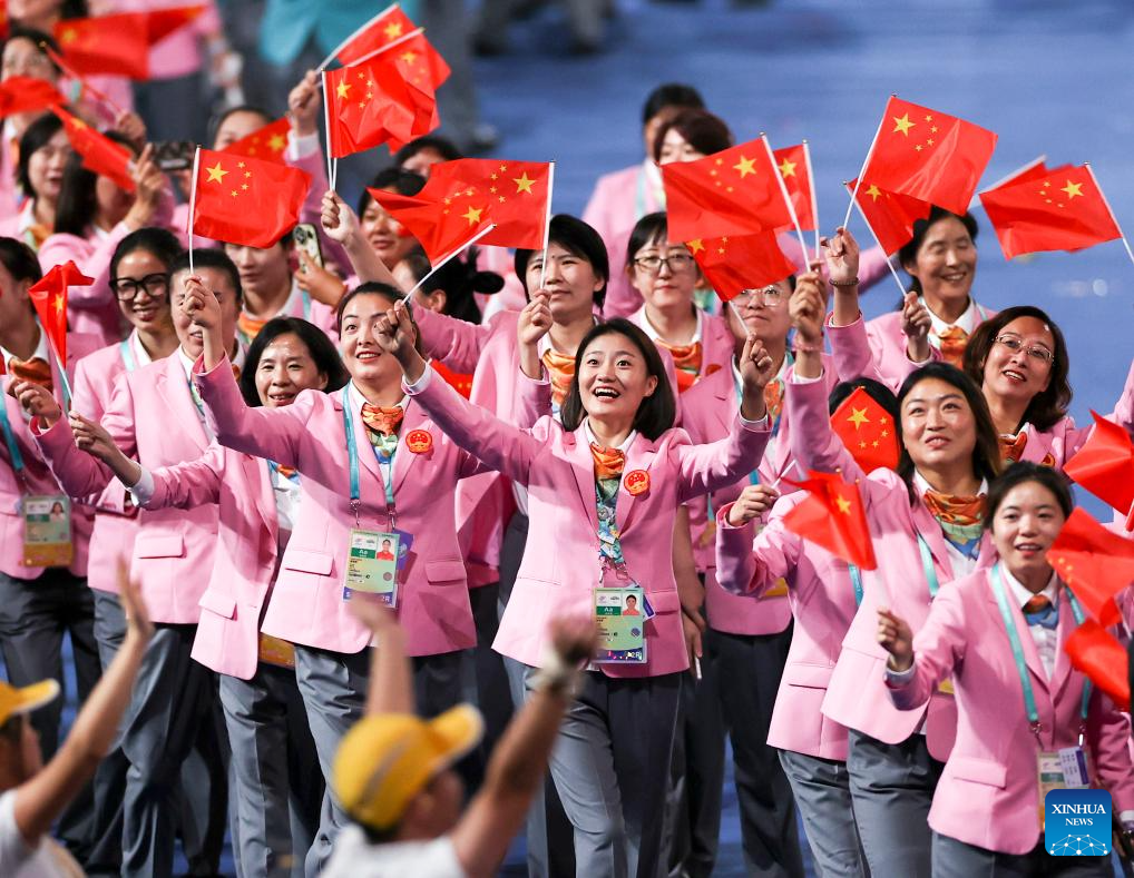 Delegation of China parade into the Hangzhou Olympic Sports Center Stadium during the opening ceremony of the 4th Asian Para Games in Hangzhou of east China's Zhejiang Province, on Oct. 22, 2023. (Xinhua/Han Chuanhao)