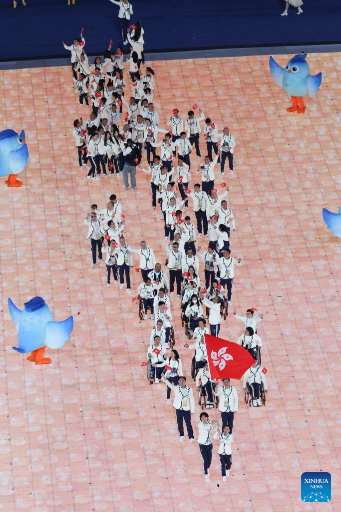 Delegation of Hong Kong, China parade into the Hangzhou Olympic Sports Center Stadium during the opening ceremony of the 4th Asian Para Games in Hangzhou of east China's Zhejiang Province, on Oct. 22, 2023. (Xinhua/Xu Yu)