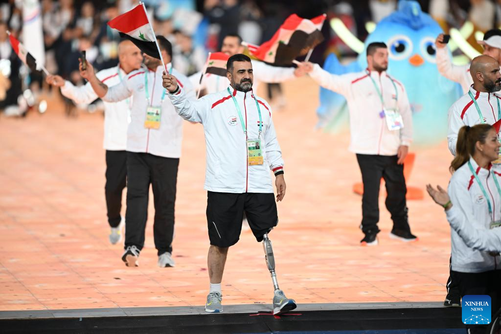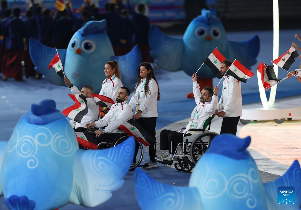 Delegation of Syria parade into the Hangzhou Olympic Sports Center Stadium during the opening ceremony of the 4th Asian Para Games in Hangzhou of east China's Zhejiang Province, on Oct. 22, 2023. (Xinhua/Huang Zongzhi)