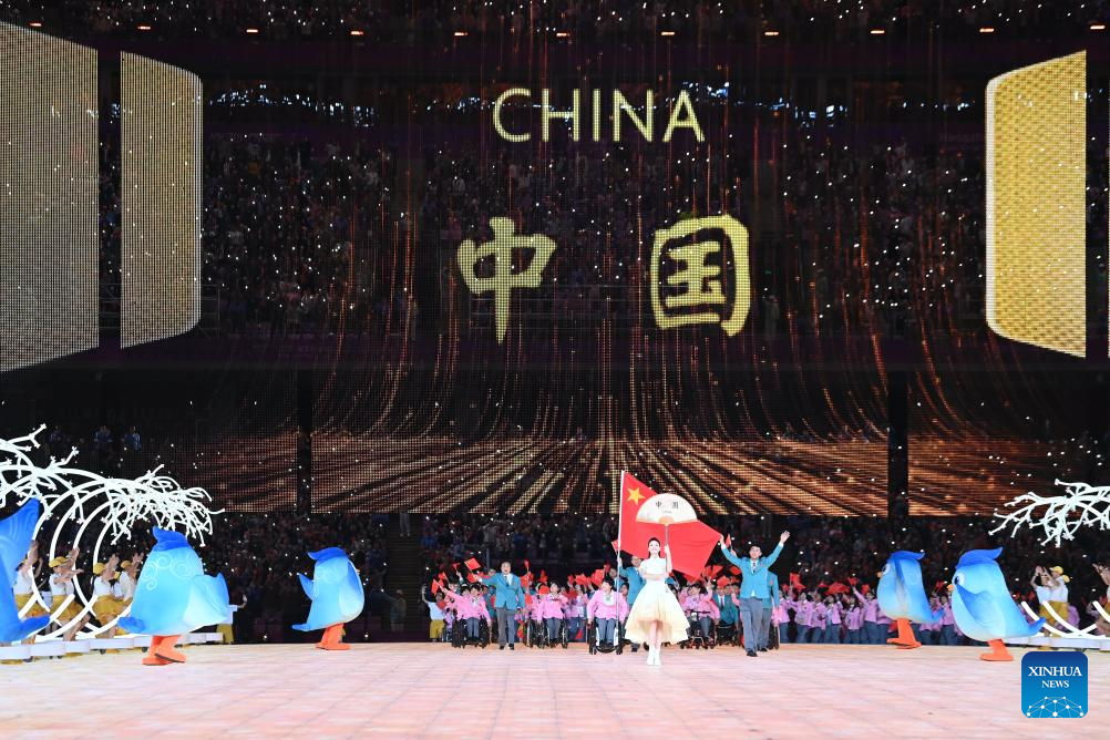 Delegation of China parade into the Hangzhou Olympic Sports Center Stadium during the opening ceremony of the 4th Asian Para Games in Hangzhou of east China's Zhejiang Province, on Oct. 22, 2023. (Xinhua/Hu Xingyu)