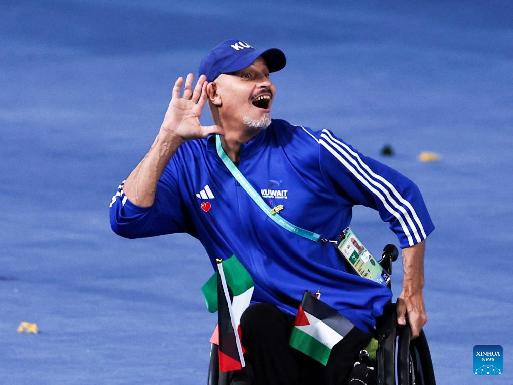 A member of delegation of Kuwait reacts during the opening ceremony of the 4th Asian Para Games in Hangzhou of east China's Zhejiang Province, on Oct. 22, 2023. (Xinhua/Jia Haocheng)