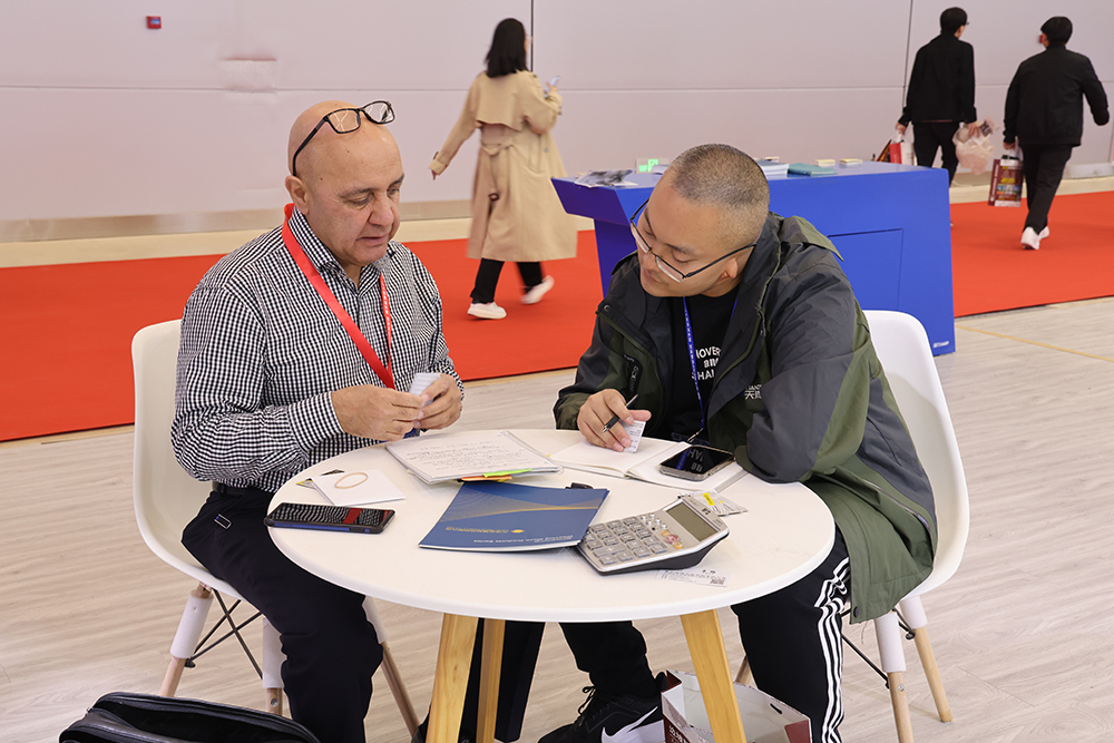 A Canadian buyer (L) converses with staff at a booth for stainless steel mesh at the 23rd China Anping International Wire Mesh Fair in Anping county, Hengshui city, north China's Hebei Province, Oct. 22, 2023. (People's Daily Online/Dai Zexin)