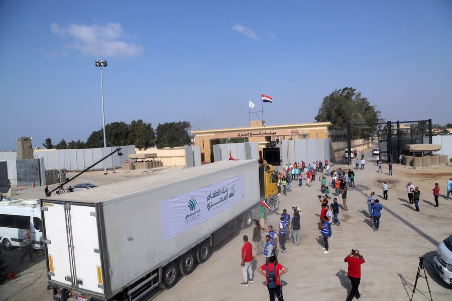 A truck loaded with humanitarian aid prepares to enter Gaza on the Egyptian side of the Rafah border crossing on Oct. 22, 2023. (Xinhua/Ahmed Gomaa)