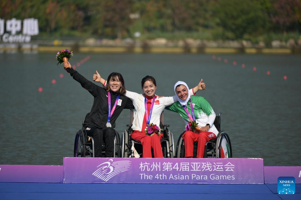 Gold medalist Xie Maosan (C) of China, silver medalist Seryu Monika (L) of Japan and bronze medalist Sara Abdolmaleki of Iran attend the awarding ceremony for the Women's KL1 of Canoe during the 4th Asian Para Games in Hangzhou, east China's Zhejiang Province, Oct. 23, 2023. (Xinhua/Li He)