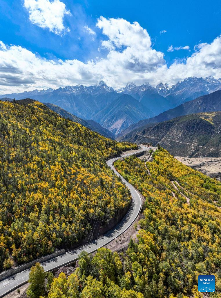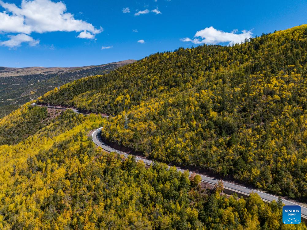 This aerial photo shows autumn scenery of Hongla Mountain in Mangkam County, Qamdo, southwest China's Tibet Autonomous Region, Oct. 20, 2023. (Xinhua/Sun Fei)