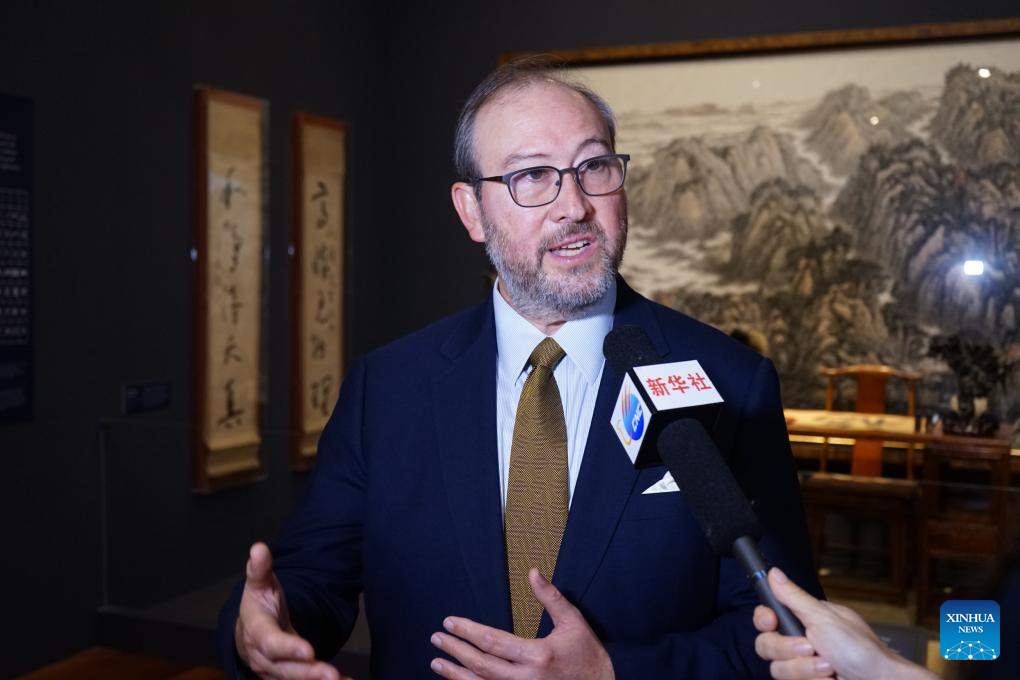 Seán O'Harrow, President and CEO of Bowers Museum, speaks during an interview at Bowers Museum in Orange County, Southern California, the United States, on Oct. 20, 2023. Bowers Museum, a premier cultural art museum in Southern California, expects to further strengthen cultural links with China and serve as a bridge for boosting U.S.-China understanding, the museum's new President and CEO, Dr. Seán O'Harrow, told Xinhua in a recent interview. (Photo by Zeng Hui/Xinhua)