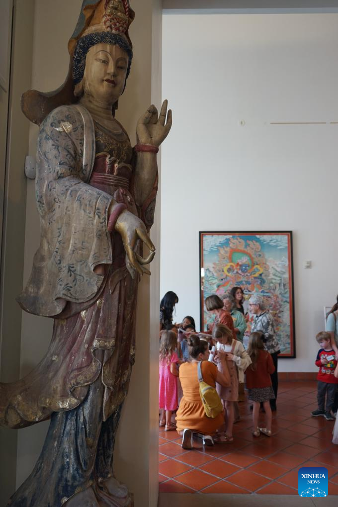 Visitors view artworks at Bowers Museum in Orange County, Southern California, the United States, on Oct. 20, 2023. Bowers Museum, a premier cultural art museum in Southern California, expects to further strengthen cultural links with China and serve as a bridge for boosting U.S.-China understanding, the museum's new President and CEO, Dr. Seán O'Harrow, told Xinhua in a recent interview. (Photo by Zeng Hui/Xinhua)