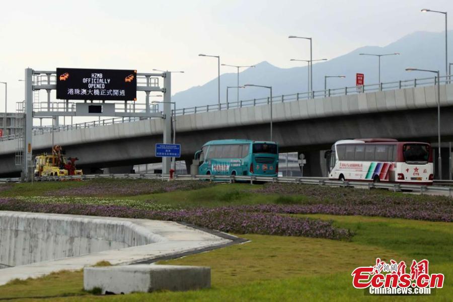 The first batch of tourist buses leaves for the Hong Kong-Zhuhai-Macao Bridge, south China's Guangdong Province, Oct. 24, 2018. (Photo provided to China News Service)