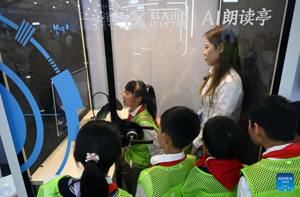 Children attend a study camp during the 6th World Voice Expo in Hefei, east China's Anhui Province, Oct. 24, 2023. The 6th World Voice Expo and the iFlytek 1024 Global Developer Festival kicked off here on Tuesday. The latest achievements and application of AI technology will be on display at the 6-day event. (Xinhua/Zhou Mu)