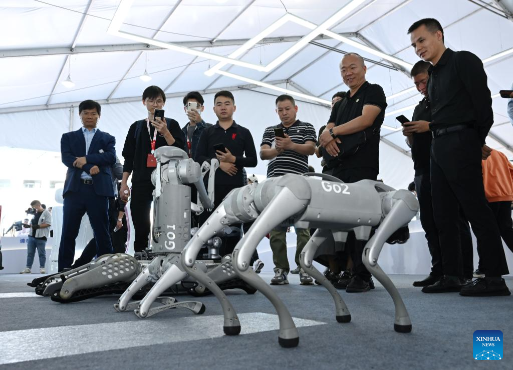 People look at robots during the 6th World Voice Expo in Hefei, east China's Anhui Province, Oct. 24, 2023. The 6th World Voice Expo and the iFlytek 1024 Global Developer Festival kicked off here on Tuesday. The latest achievements and application of AI technology will be on display at the 6-day event. (Xinhua/Zhou Mu)