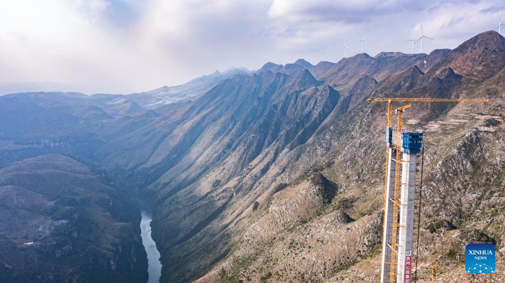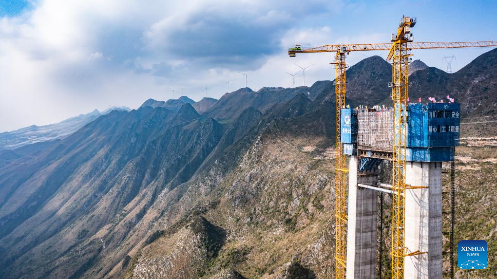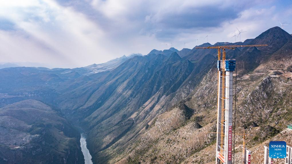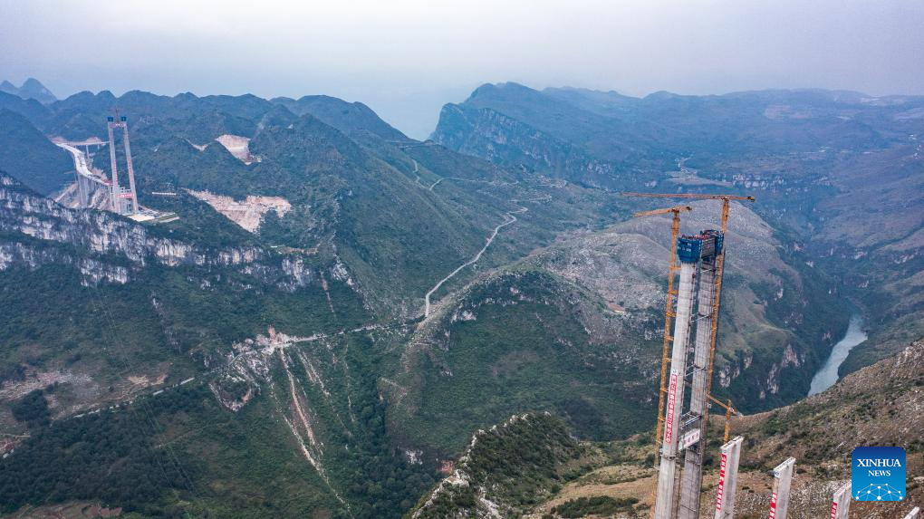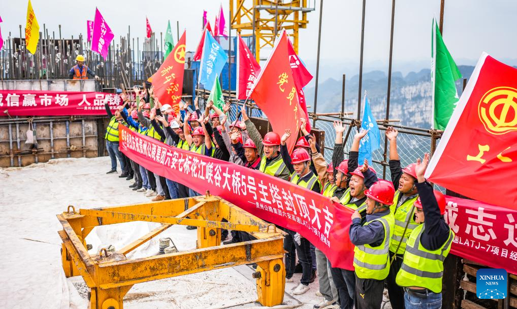GUIYANG, Oct. 24 (Xinhua) -- The last main tower of the Huajiang grand canyon bridge was completed on Tuesday in southwest China's Guizhou Province, marking a major milestone in the building of the world's highest bridge.