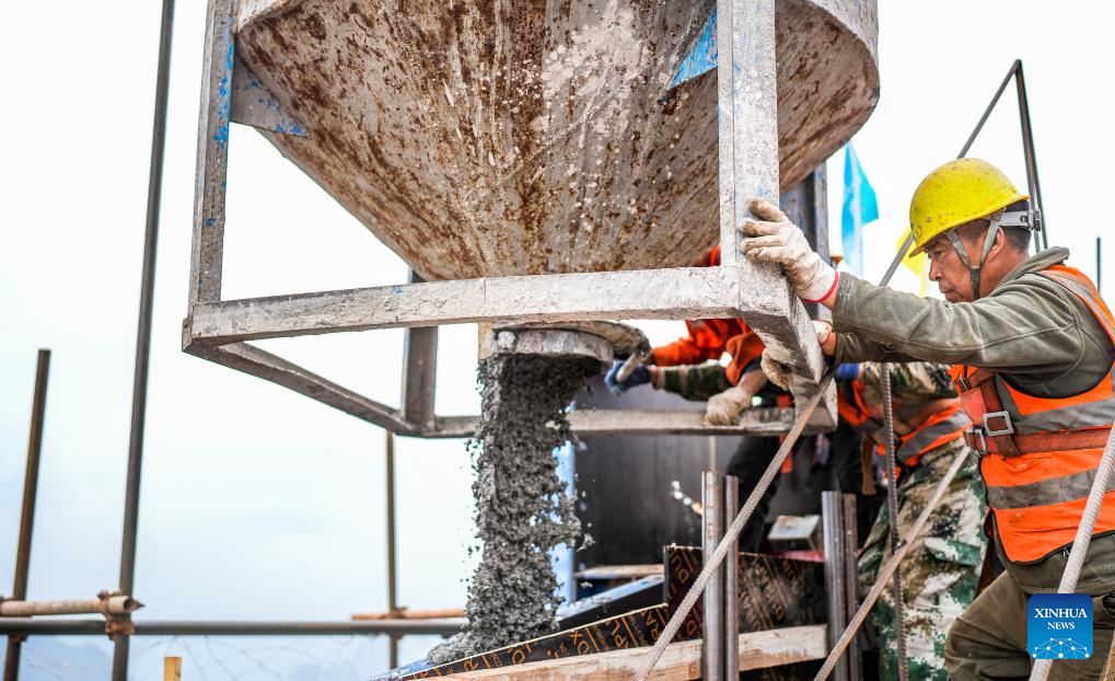 Builders work on a main tower of the Huajiang grand canyon bridge in southwest China's Guizhou Province, Oct. 24, 2023. (Xinhua/Tao Liang)