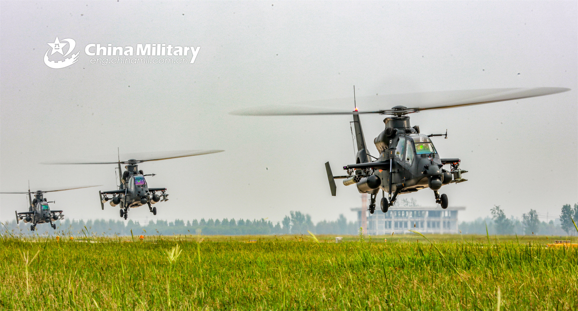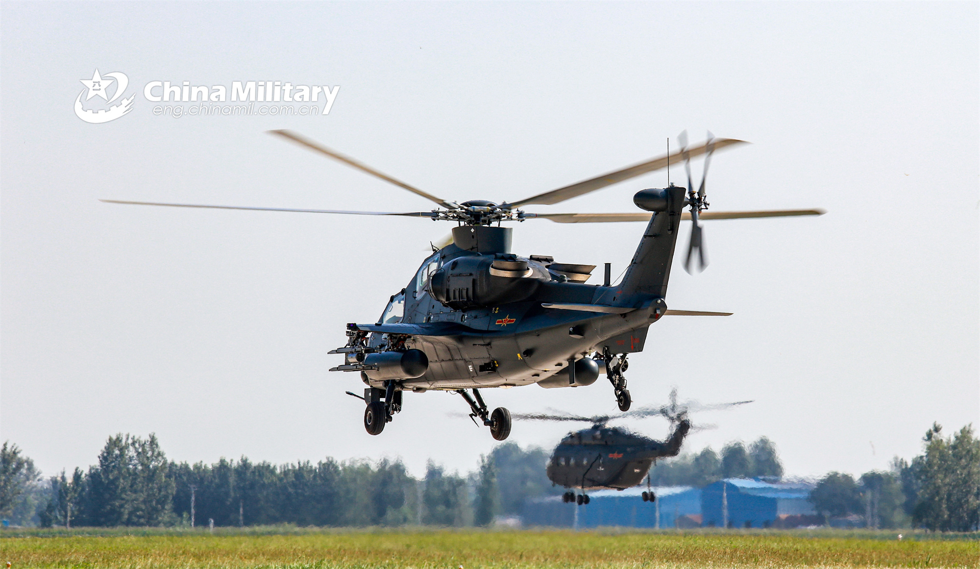Attack helicopters attached to an army aviation brigade under the PLA 80th Group Army lift off from parking apron during a flight training mission on October 11, 2023. (eng.chinamil.com.cn/Photo by Liu Yuchen)