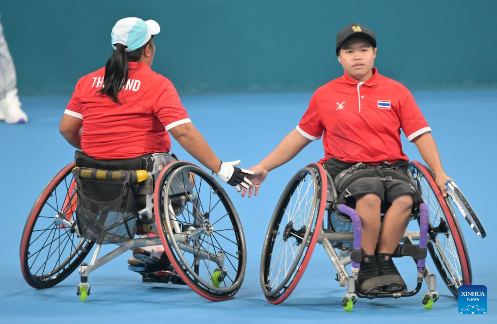 Thailand's Sakhon Khanthasit(L)/Thipaksorn Singkeaw clap hands during the Women's Doubles Semifinal of Wheelchair Tennis against China's Guo Luoyao/Zhu Zhenzhen at the 4th Asian Para Games in Hangzhou, east China's Zhejiang Province, Oct. 24, 2023. (Xinhua/Cai Yang)