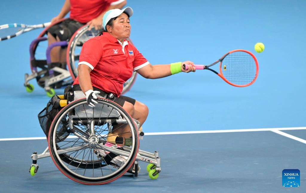 Thailand's Sakhon Khanthasit hits a return during the Women's Doubles Semifinal of Wheelchair Tennis between Thailand's Sakhon Khanthasit/Thipaksorn Singkeaw and China's Guo Luoyao/Zhu Zhenzhen at the 4th Asian Para Games in Hangzhou, east China's Zhejiang Province, Oct. 24, 2023. (Xinhua/Cai Yang)