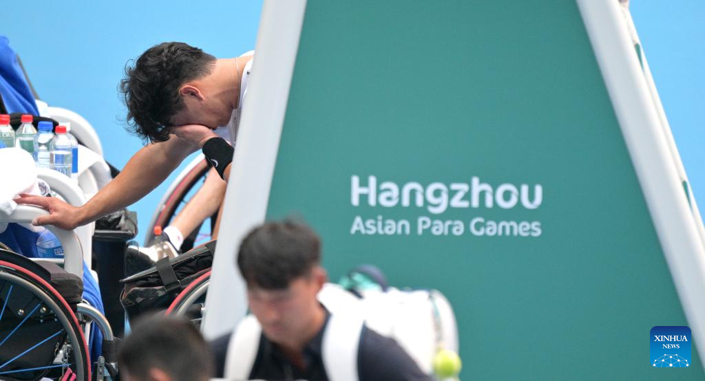 South Korea's Im Howon (R) is comforted by his teammate Han Sungbong after winning the Men's Doubles Quarterfinal of Wheelchair Tennis against China's Dong Shunjiang/Ji Zhenxu at the 4th Asian Para Games in Hangzhou, east China's Zhejiang Province, Oct. 24, 2023. (Xinhua/Cai Yang)